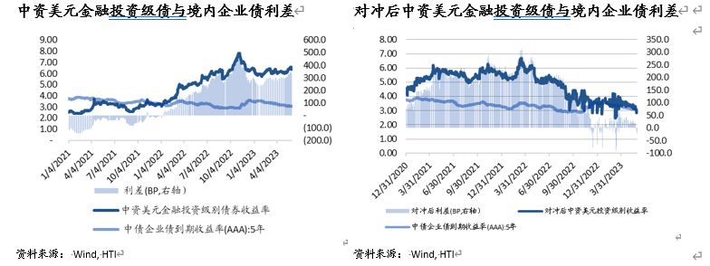 5月中资美元金融投资级债券境内外利差收窄,对冲后利差空间较低。截至2023年5月底,中资美元金融投资级债券收益率与境内中债企业债(AAA)到期收益率利差为328.1个基点,本月利差上升36.6个基点,年至今上升28.3个基点。2021年以来中资金融投资级债和境内中债企业债(AAA)到期收益率利差均值为118.6个基点,5月底利差处于历史较高水平,2023年以来利差震荡上行。对冲后中资美元债金融投资级债券收益率为2.91%,和境内中债企业债(AAA)利差均值为-17.7个基点。
