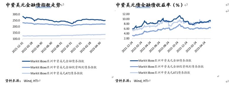 中资美元金融债微跌,AT1债券上涨,整体收益率阶段性上行。2023年4月28日至5月31日,Markit iBoxx中资美元金融债券指数下跌1.81%,金融投资级别债券指数下跌0.10%,AT1债券指数上升0.36%。年初至5月31日,Markit iBoxx中资美元金融债券指数下跌0.05%,金融投资级别债券指数上升2.71%,AT1债券指数上升3.41%。截至2023年5月31日,Markit iBoxx中资美元金融债券指数收益率为9.23%,金融投资级别债券指数收益率为6.37%,AT1债券指数收益率为9.01%。收益率较上月底分别上升17.5个基点、上升27.6个基点和上升32.6个基点。