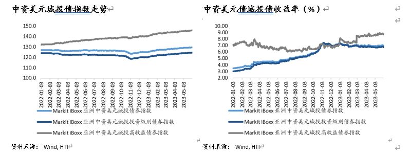 中资美元债城投债指数保持涨势,投资级城投债收益率企稳。2023年5月,Markit iBoxx中资美元城投债券指数上升0.49%,Markit iBoxx城投投资级别债券指数上升0.47%,Markit iBoxx城投高收益债券指数上升0.60%。年初至5月31日,中资美元城投债券指数上升3.82%,城投投资级别债券指数上升3.78%,城投高收益债券指数上升4.13%。截至2023年5月31日,中资美元城投债券指数收益率为6.94%,城投投资级别债券指数收益率为6.73%,城投高收益别债券指数收益率为8.69%。收益率较上月底分别上升6.7个基点、上升2.0个基点和上升15.3个基点。